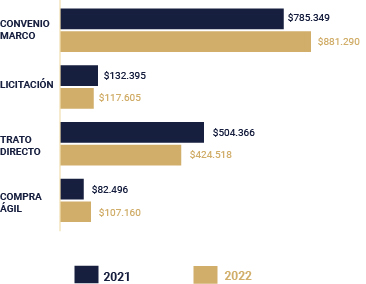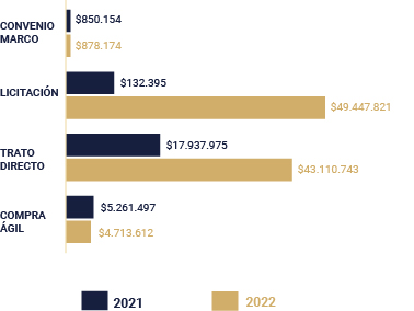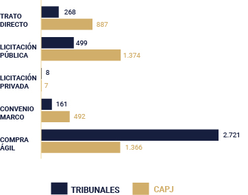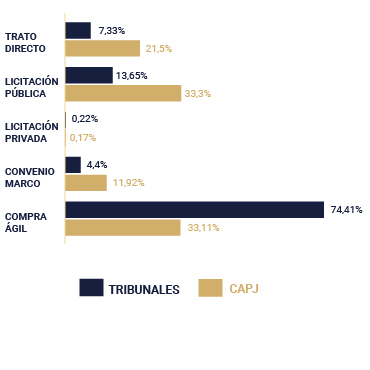 En virtud de lo anterior, el mecanismo de contratación con los montos totales anuales más alto, corresponde aquellas órdenes de compras generadas a través de Licitación Pública, representando el 33,3% del monto total de las órdenes de compras en el caso de la CAPJ, y un 74,41% del monto total a través de Compra Ágil para los Tribunales Reformados.